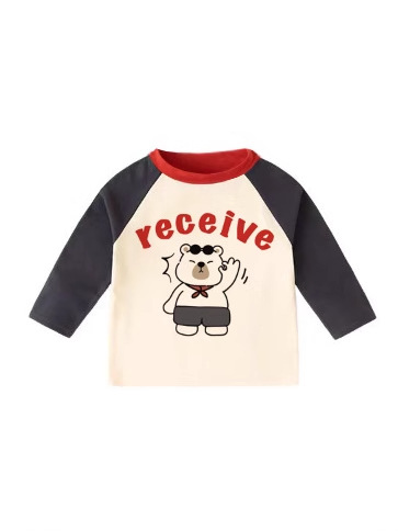 This kids' T-shirt features a classic raglan sleeve design, with a cream body paired with brown sleeves and a blue collar, creating a rich visual layer that is lively and cute. The front is printed with a cartoon bear wearing sunglasses, paired with the "receive" English slogan, full of childlike fun and a playful style. Made of soft and skin-friendly knitted cotton, the fabric is breathable and sweat-wicking, gentle on children's skin. The loose fit does not restrict movement, suitable for both boys and girls, perfect for daily casual wear, campus and loungewear.