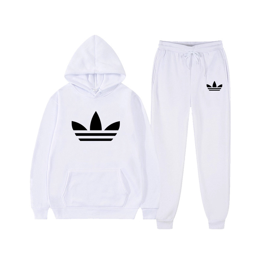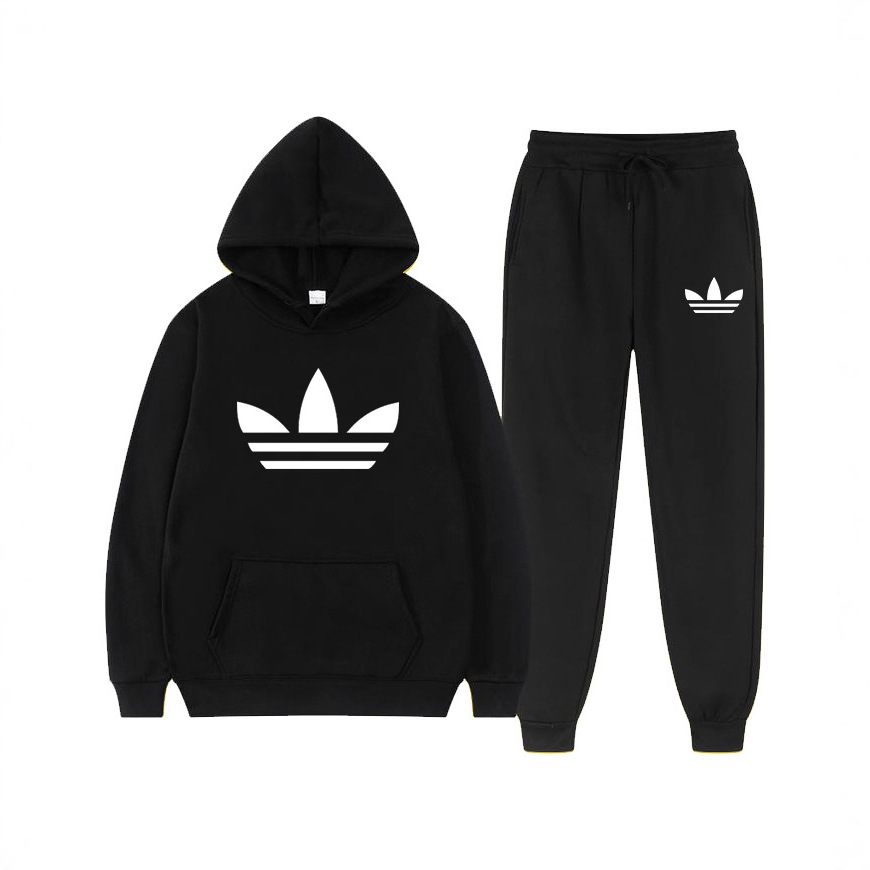 This tracksuit set is made of skin-friendly fleece/cotton blend fabric, which is soft, thick, warm and breathable, offering unrestricted comfort. The top is a classic pullover hoodie with a kangaroo pocket and drawstring hood, printed with a black trefoil logo on the front, minimalist and trendy. The bottom is a jogger style with an elastic drawstring waistband and ribbed cuffs, convenient for movement and sleek in appearance. The overall casual sporty style is suitable for daily outings, home wear, light exercise and other scenarios.