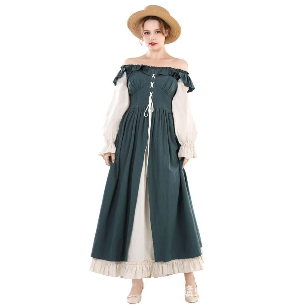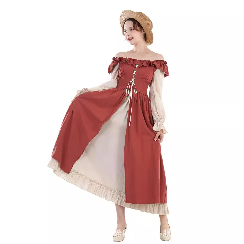 This dress features a retro country manor style, with a striking red and off-white patchwork that exudes a pastoral atmosphere. The ruffled square neck flatters the neckline and highlights an elegant temperament. The cross lace-up design on the chest cinches the waist for a slimmer look, paired with a matching drawstring tie to further refine the waistline. The puffed long sleeves with flared cuffs are gentle and dynamic, while the large A-line skirt with layered ruffled hem is flowy and rhythmic when walking. The skin-friendly and drapey fabric is suitable for spring and autumn, perfect for pastoral photoshoots, retro parties, and themed outings.