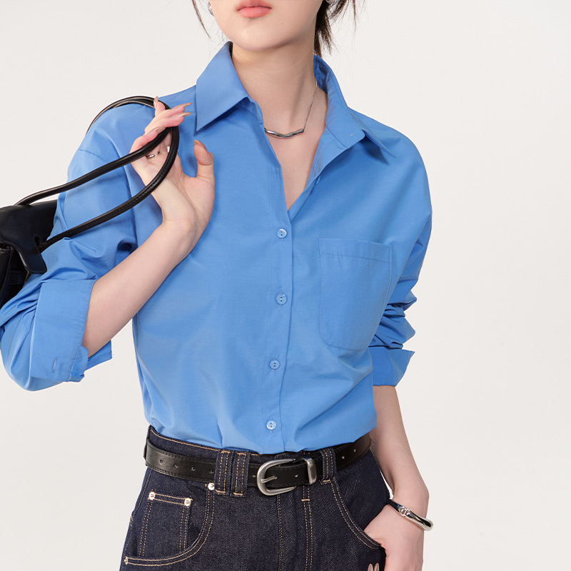 This shirt is made of high-count cotton blend fabric, which is smooth, delicate, breathable and wrinkle-resistant, with a gentle and relaxed vibe. The classic lapel collar + single-breasted placket restores the basic shirt style. The chest patch pocket design combines practicality and minimalist texture. The oversized dropped-shoulder sleeves + curved high-low hem soften the shoulder line, suitable for all body types, casual and comfortable, and can be worn alone or layered. It is an ideal item for daily casual, commuting and sweet style wear in spring and autumn.