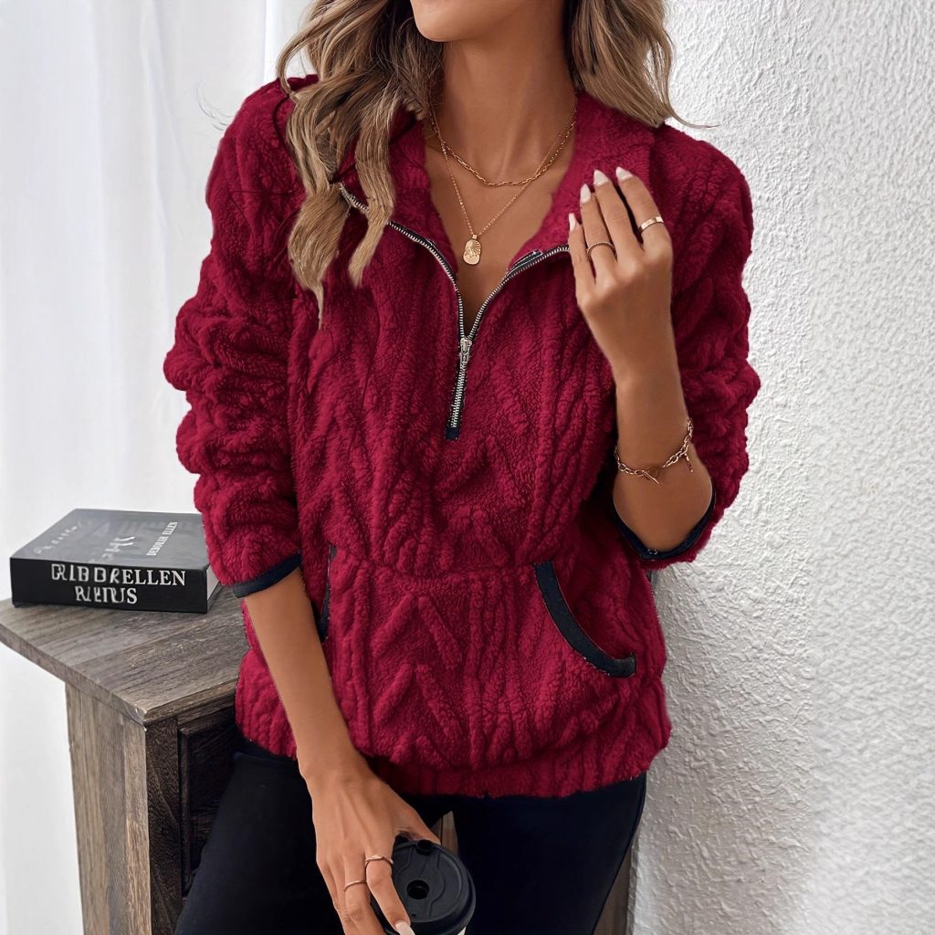This sweatshirt is made of thick faux lamb fleece fabric, which is fluffy, soft and warm, ideal for autumn and winter. The half-zip stand collar allows free adjustment of the neckline opening, combining windproof performance and fashion sense. The cable knit embossed craft adds 3D texture and retro atmosphere. The waist drawstring + contrast pocket design can shape the waist, while enhancing practicality and visual layering. The loose fit suits all body types, making it a gentle item for daily casual wear and home warmth in autumn and winter.
