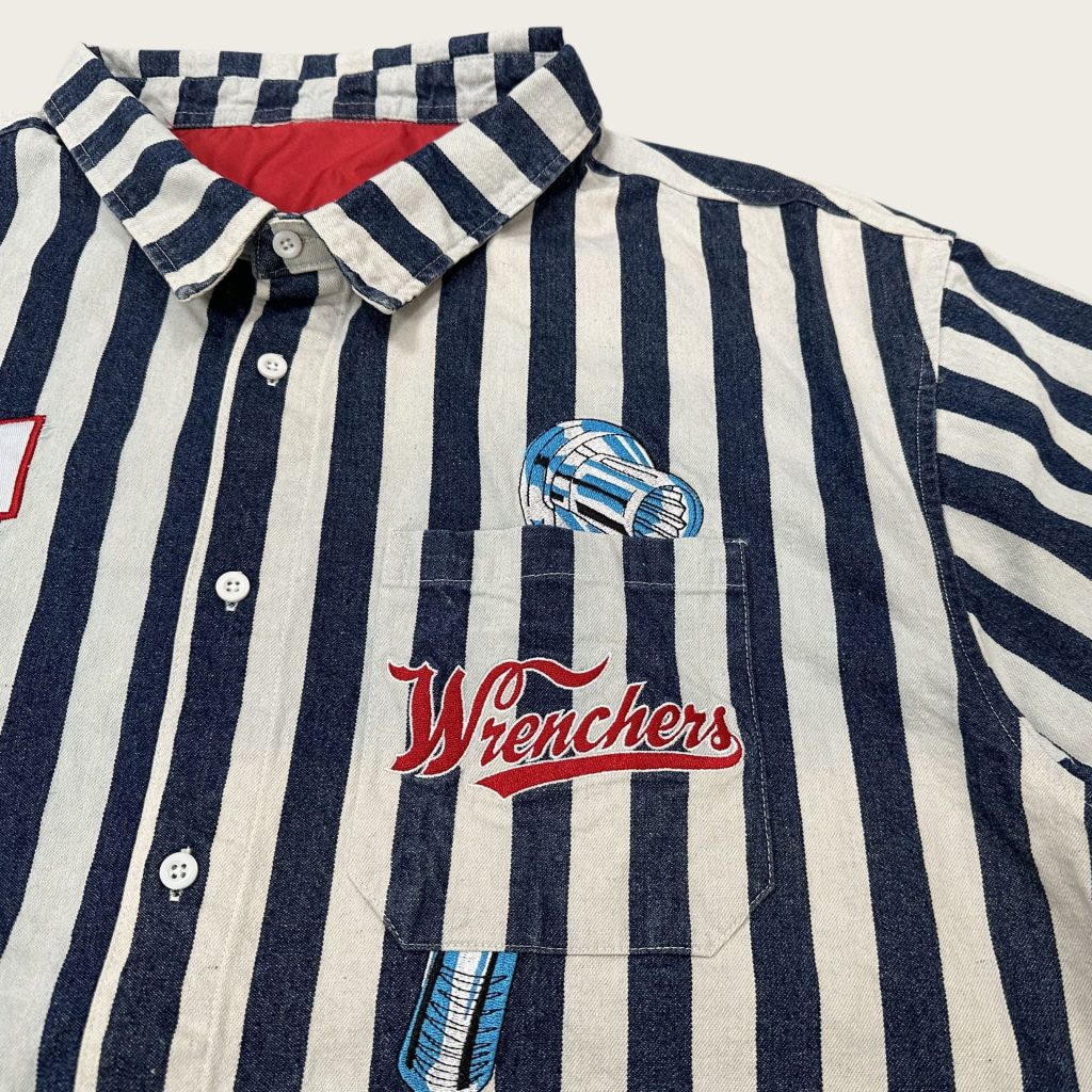 This shirt features classic navy and white vertical stripe fabric, with an American retro workwear vibe full of nostalgia and street fashion. The lapel collar is neat and smart, with white buttons on the placket. The chest patch pocket is printed with retro lettering and wrench embroidery, and there is a "SERVICE MANAGER" cloth label on the left side, full of American auto repair workwear style in details. The loose fit ensures unrestricted comfort, and the red lining inside the collar enhances the detail texture. It can be worn alone or layered to create an American retro, street workwear or retro biker style.