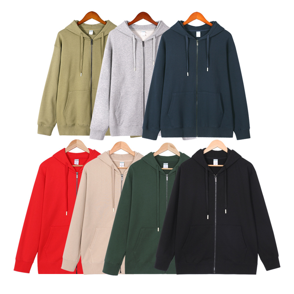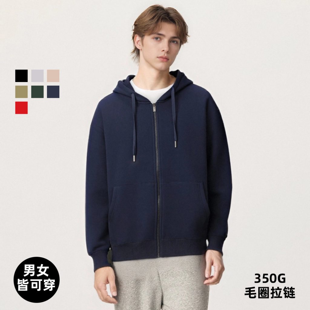 This sweatshirt features a classic hooded zip-up cardigan design, with a simple solid-color look and no extra decorations, making it versatile for various styling scenarios. The hood comes with matching drawstrings adorned with metal tips for exquisite details; the full-zip placket allows easy wearing and adjustable neckline opening.