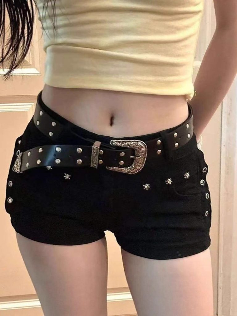 This pair of denim shorts features a hot girl style with a low-rise design, which precisely highlights the waistline and abdominal curves to create a sexy street look. The entire pant body is decorated with silver rivets and cross hardware, and the side eyelets add a punk texture with strong personality. It comes with a matching retro carved metal buckle belt, which can be adjusted freely to further enhance the Y2K style. Made of stretch denim, the fabric is structured and fits the body well, and the rolled cuffs make the legs look longer. It is suitable for personalized occasions such as music festivals, street outings and parties.