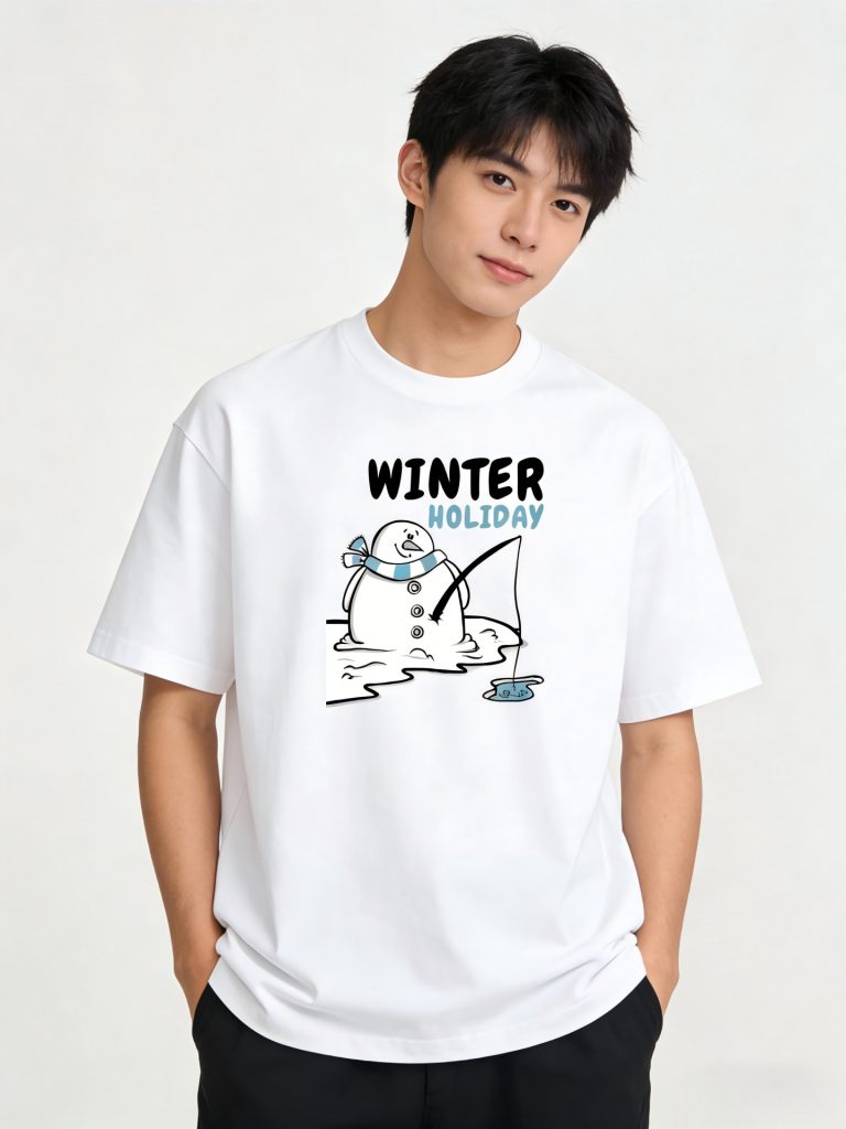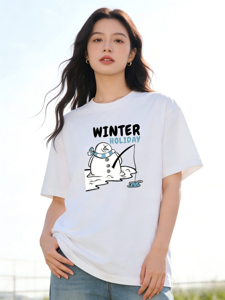 This T-shirt features a classic crew neck design, which is simple and versatile and suitable for all body types. The front is printed with a fun cartoon snowman fishing pattern, paired with the "WINTER HOLIDAY" English slogan, full of winter atmosphere and childlike fun, with a light and lively style. Made of heavyweight combed cotton, the fabric is thick and crisp with good drape, breathable and sweat-absorbent, and resistant to deformation and wrinkling. The oversized dropped-shoulder silhouette is lazy and casual, effectively flattering the figure. It is suitable for various occasions such as casual daily wear, campus style and street fashion, making it a basic item that combines personality and comfort.