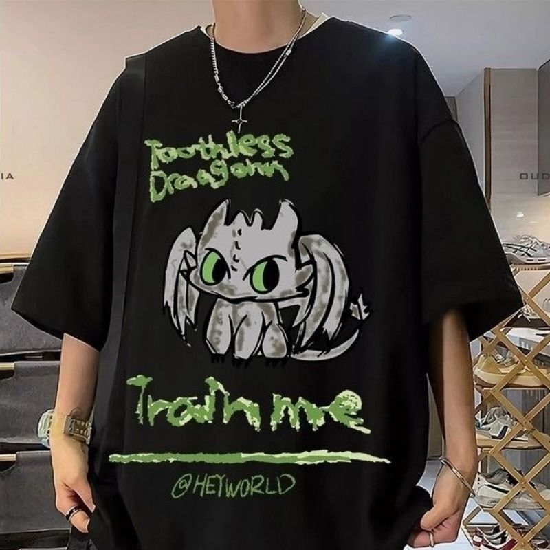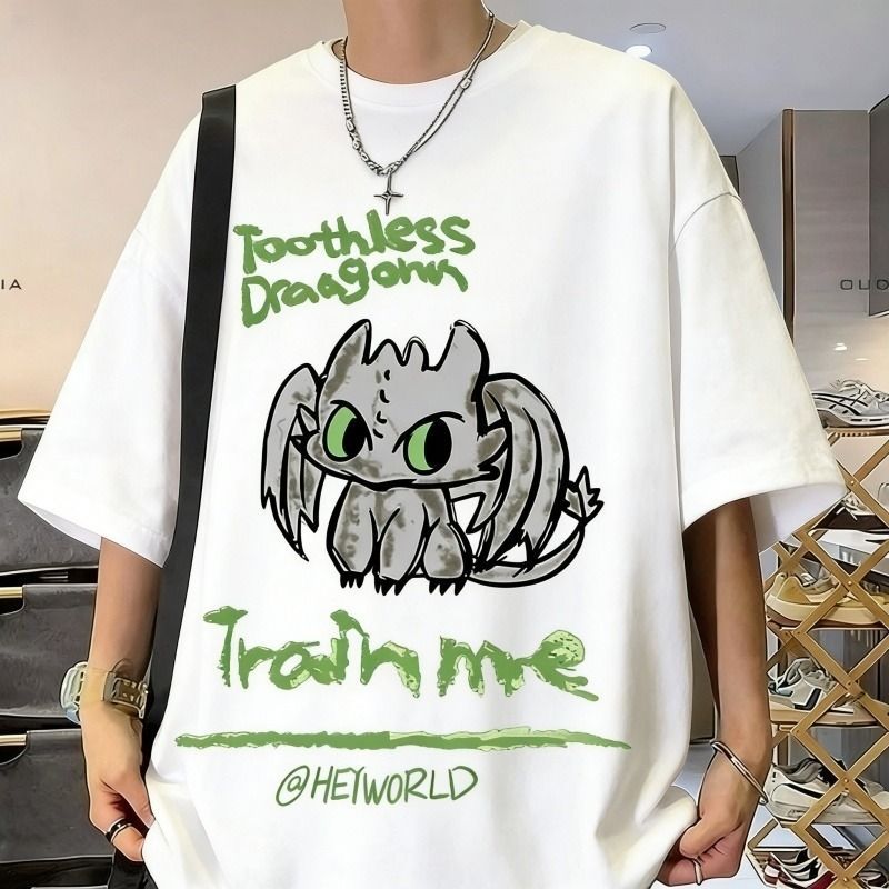 This short-sleeve T-shirt features the classic character "Toothless" from How to Train Your Dragon as its core design element, drawn in a cute Q-version cartoon style with a vintage gray-green tone to restore the character's lively and lovely image. The front of the shirt is printed with fun English slogans such as "Toothless Draagon" and "Train me", with the designer's signature "@HEYWORLD" at the bottom, creating a casual, playful and trendy overall style.