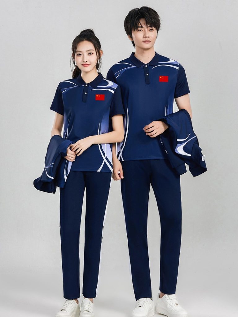 This sports set features a white base with black and red color-blocked lines, creating a neat and dynamic look full of athletic vitality. The top is a classic turn-down collar Polo style, with a national flag logo printed on the left chest, highlighting patriotism and national trend style. The button placket is simple and capable, and the fabric is breathable and quick-drying, suitable for sports scenarios. The bottom is white straight-leg sports long pants with a "CHN" logo printed on the leg. The elastic waistband ensures a comfortable fit without restriction, suitable for different body types. The whole set can be used for team sports, casual daily wear, campus style, event appearance and other occasions. It is a unisex style that looks neat and energetic.