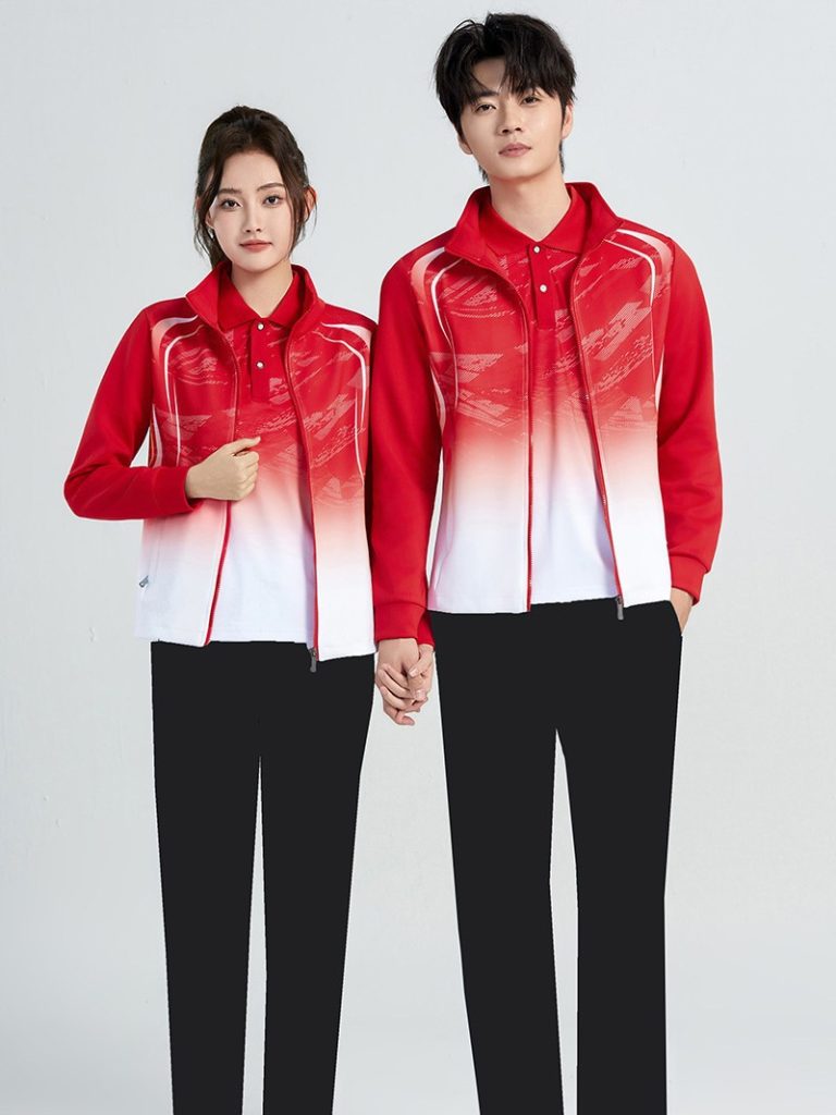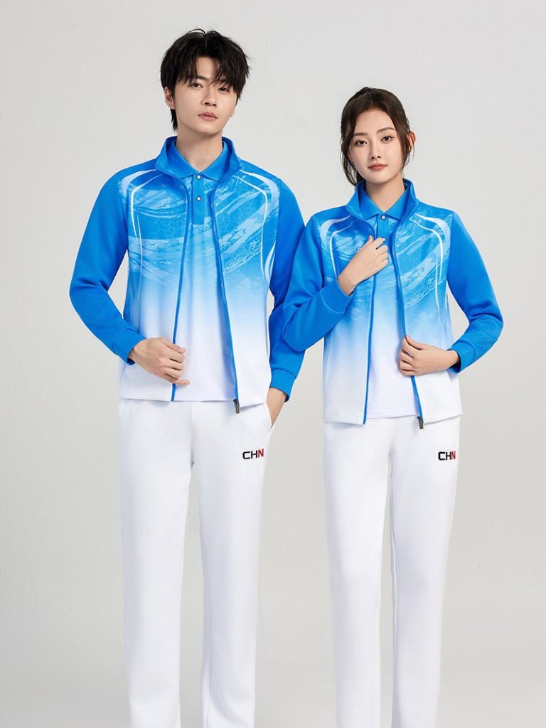 This sports set features a gradient print design, with a natural and smooth transition from navy blue to white, paired with dynamic line textures, combining vitality and fashion sense. The top is a classic turn-down collar Polo style with a button placket, made of breathable and quick-drying fabric, suitable for sports scenarios. The bottom is white straight-leg sports long pants with a "CHN" logo printed on the leg, highlighting the national trend style. The elastic waistband ensures a comfortable fit without restriction, suitable for different body types. The whole set can be used for team sports, casual daily wear, campus style and other occasions. It is a unisex style that looks neat and energetic.